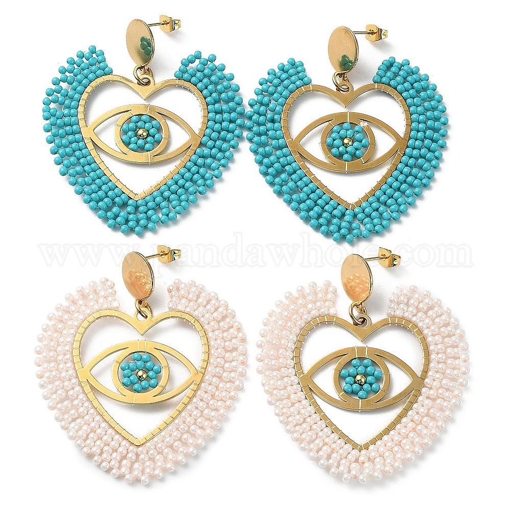 • Льняное Полотно Серьги-гвоздики с подвесками в виде сердца с глазками из плетеного стекла и латунных бусин, с вакуумным покрытием PVD 304 штифты из нержавеющей стали, белье, 57x52 мм