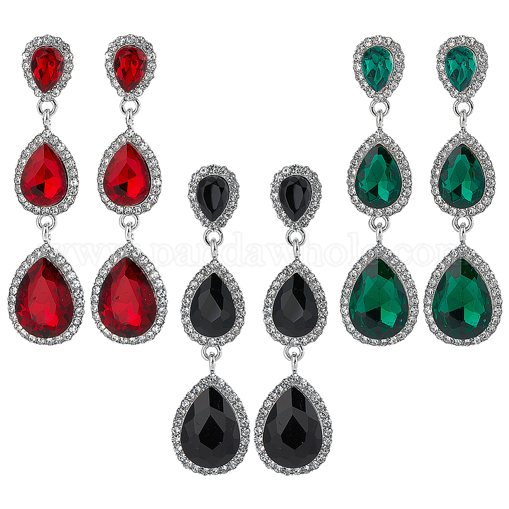 серьги-пусеты со стразами из стекла и каплевидной формы: ширина около 17 мм., 67 мм длиной, 3 цветов, 1 пара / цвет, 3 пары;