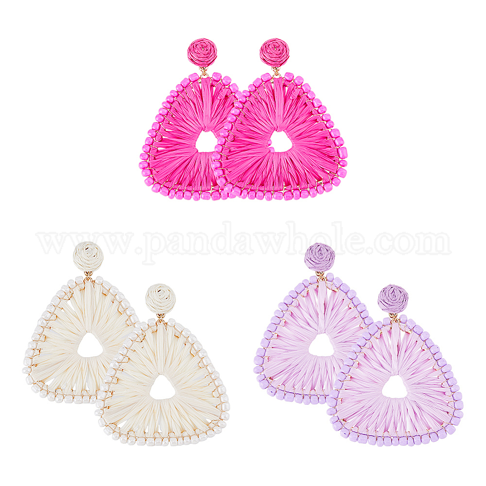 Серьги-гвоздики с треугольными плетениями из рафии и травы: длина около 73.5 мм., шириной 60 мм , 3 цветов, 1 пара / цвет, 3 пары;
