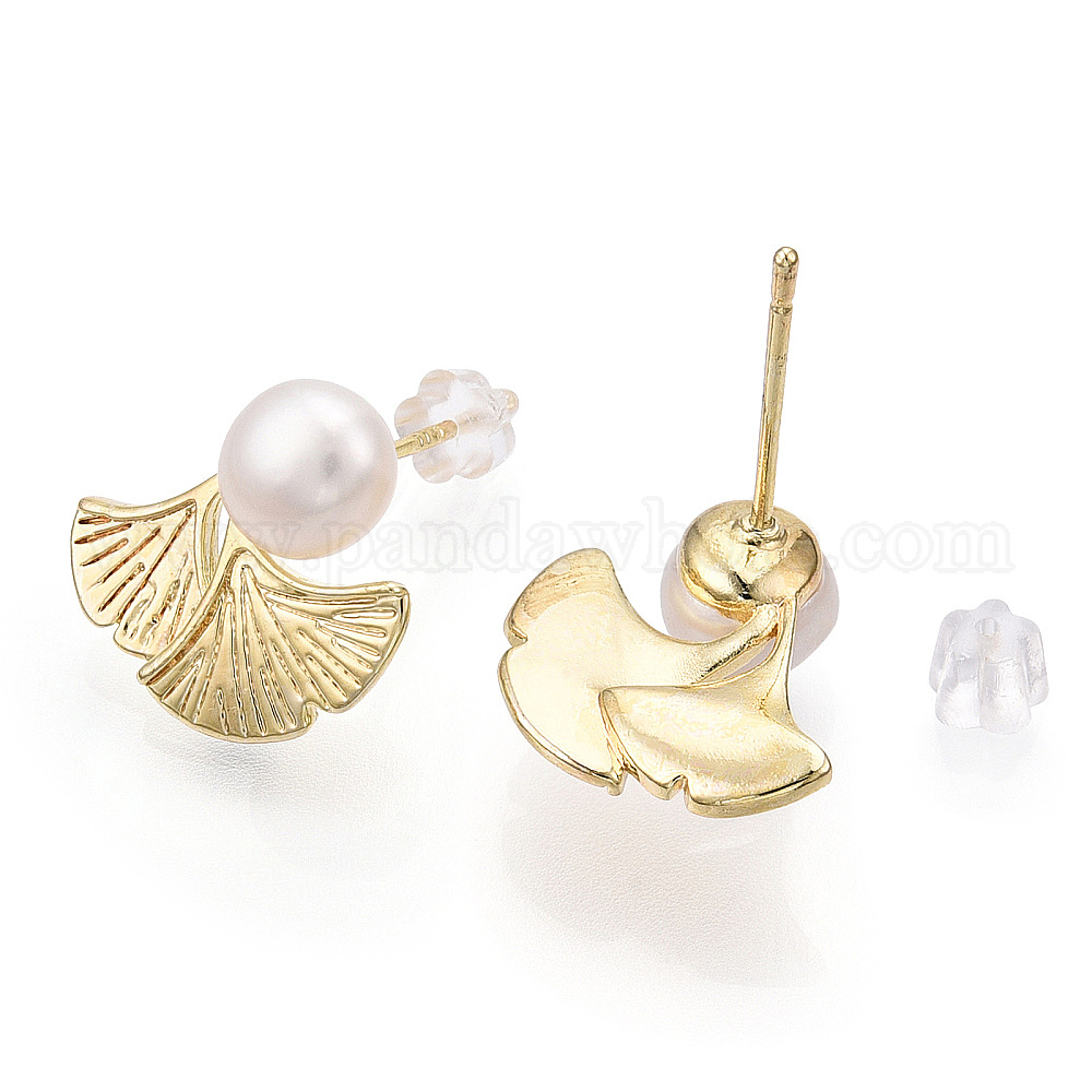 Серьги-гвоздики из латуни с листьями гинкго и натуральным жемчугом, с 925 штырями стерлингового серебра
