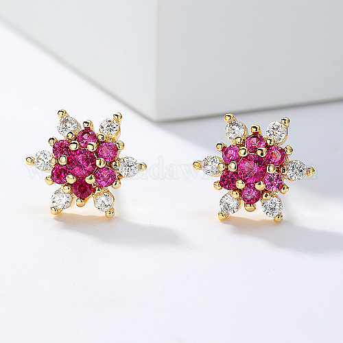 • Темно-Розовый Серьги-гвоздики из латуни с микропаве из кубического циркония для женщин, цветок, темно-розовыми, 10 мм