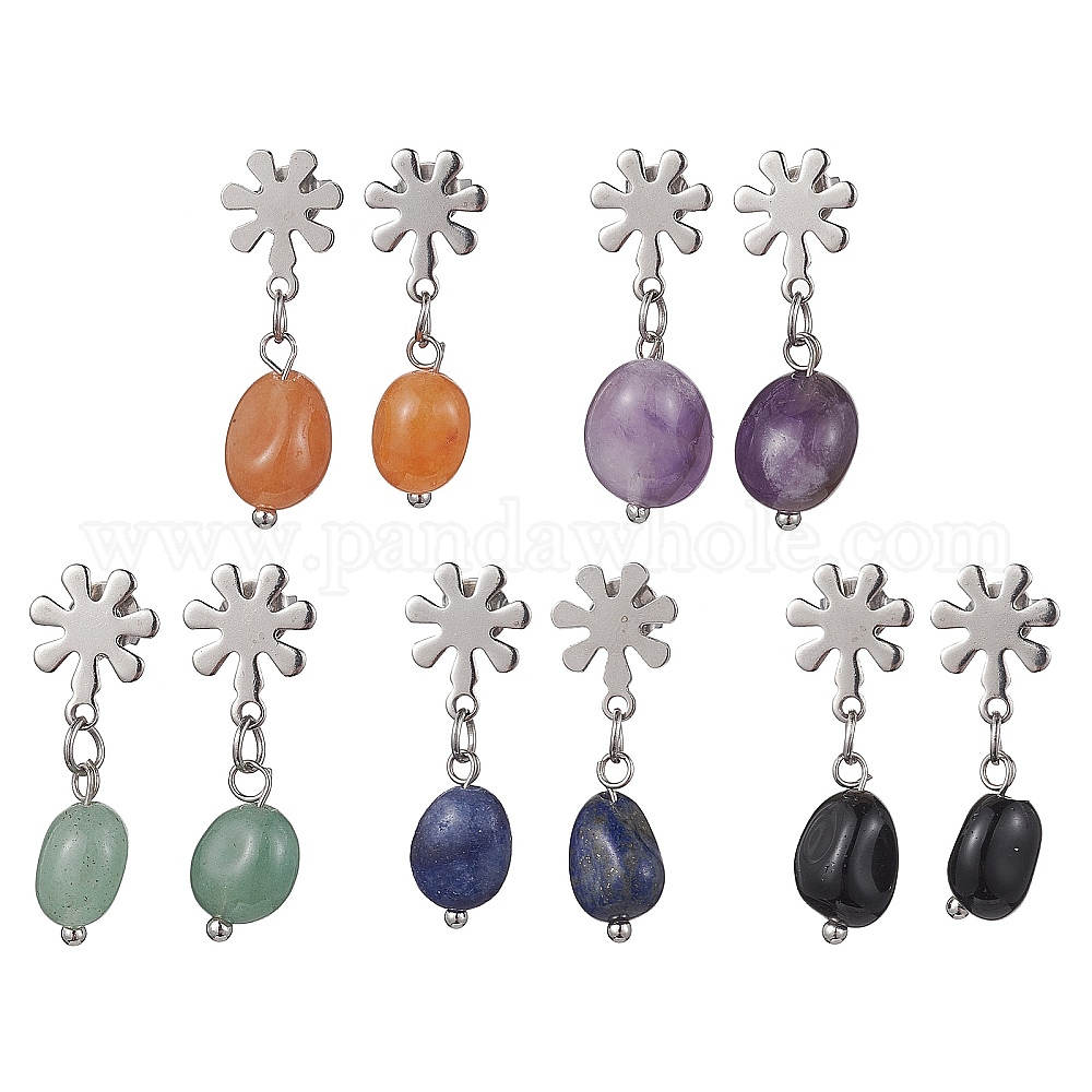 • Смешанные камни Овальные серьги-гвоздики с подвесками из натуральных смешанных драгоценных камней, 304 серьги-цветки из нержавеющей стали, 25~26x7 мм