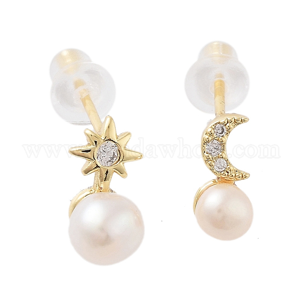 • Настоящее золото 14K Асимметричные серьги-гвоздики из натурального жемчуга, с латунными фурнитурами из циркония микропаве и булавками из стерлингового серебра 925, Вс & луна, реальный 14 k позолоченный, 9~10x4~5.5 мм
