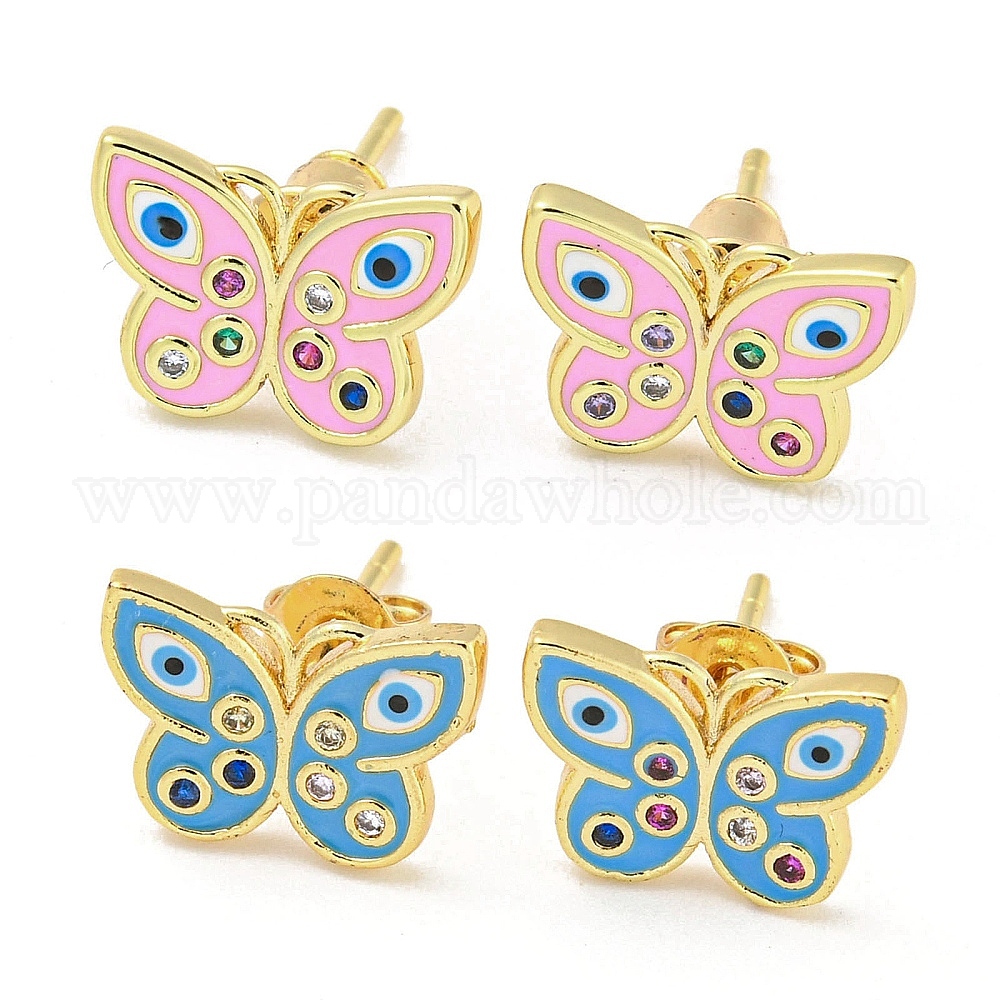 Серьги-гвоздики из настоящей позолоченной латуни бабочка со сглазом, с эмалью и фианитами