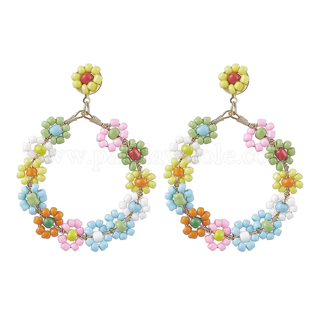 • Разноцветный Серьги с подвесками из плетеного цветка из стеклянного бисера, 304 серьги-гвоздики из нержавеющей стали для женщин, красочный, 66x48 мм