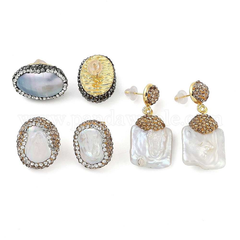 Серьги-гвоздики ручной работы из индонезийской стали с покрытием стойки/овальной латуни со стразами и натуральным жемчугом, долговечный (02TX98)