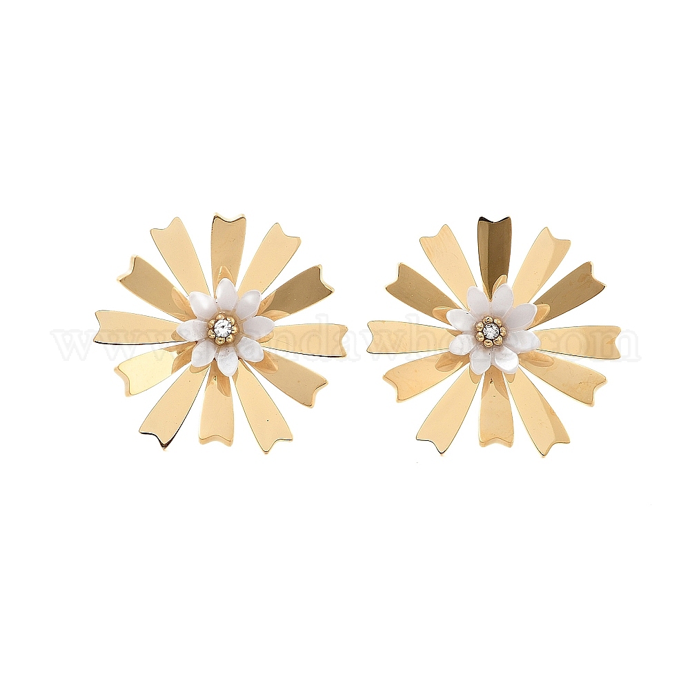 • Золотой 304 Серьги-гвоздики из нержавеющей стали с прозрачным кубическим цирконием и жемчугом, цветок, белые, золотые, 23x23 мм