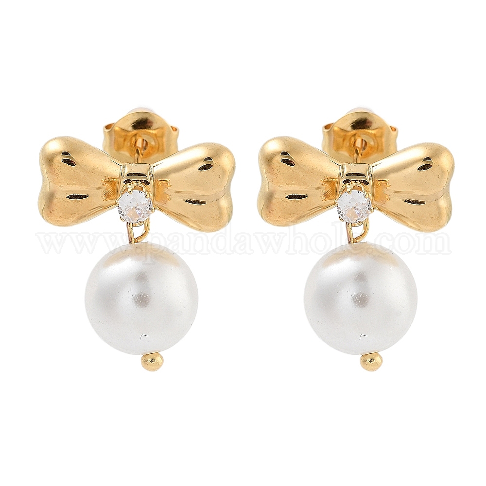 • Золотой 304 Серьги-гвоздики из нержавеющей стали с прозрачным кубическим цирконием и жемчугом, бантом, золотые, 21x17 мм