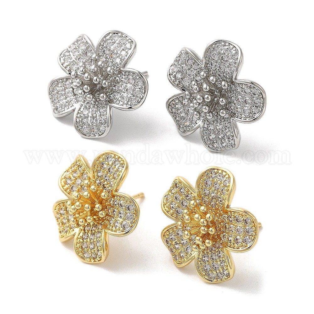 • Золотой Серьги-гвоздики из латуни с прозрачным фианитом, долговечный, без свинца и без кадмия, цветок, золотые, 20x20 мм