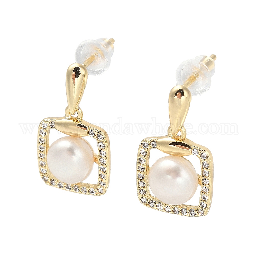 • Настоящее золото 14K Натуральные жемчужные ушные шпильки, с латунными фурнитурами из прозрачного циркония с микропаве и булавками из стерлингового серебра 925, квадратный, реальный 14 k позолоченный, 18.5x10.5 мм