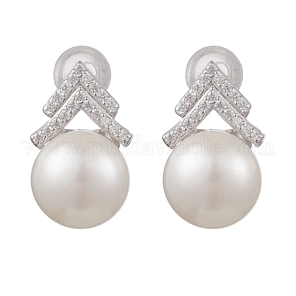 Натуральные жемчужные ушные шпильки, с прозрачным серебром микропаве и фурнитурой из прозрачного кубического циркония, круглые