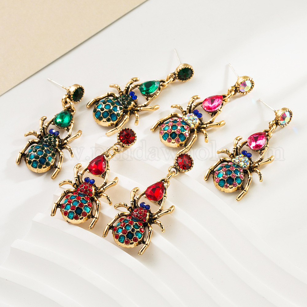 Серьги-гвоздики из сплава и стеклянных страз, паук, золотые