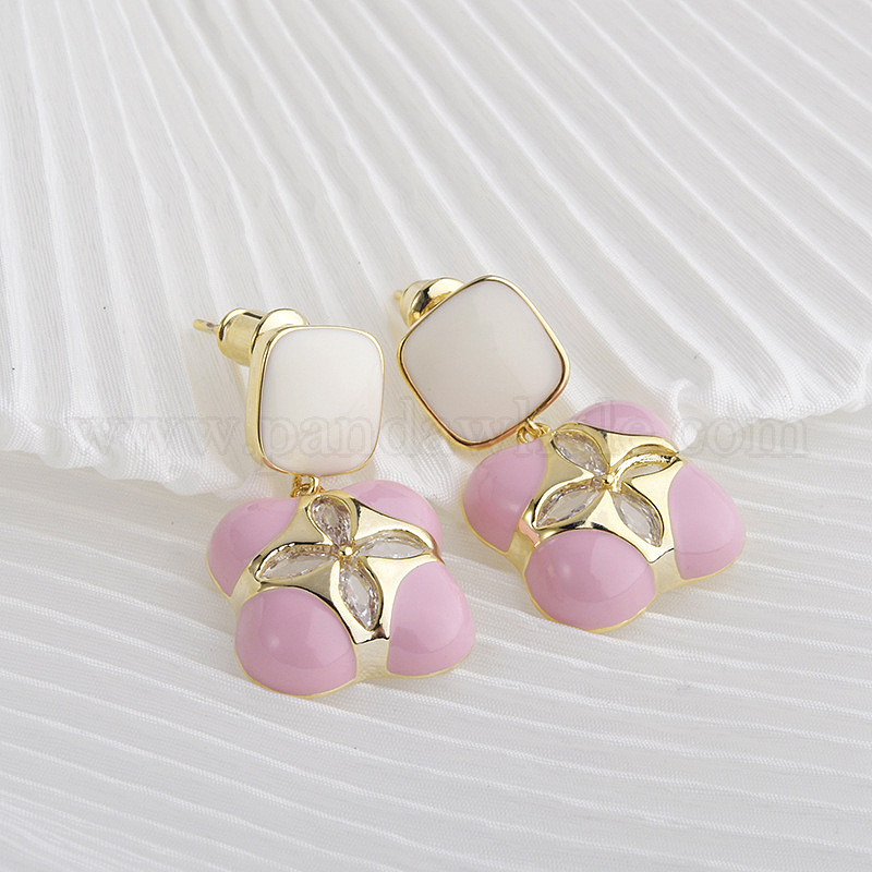 • Pink Серьги-гвоздики с цветочной эмалью из латуни для женщин, реальный 14 k позолоченный, розовые, 22x15 мм