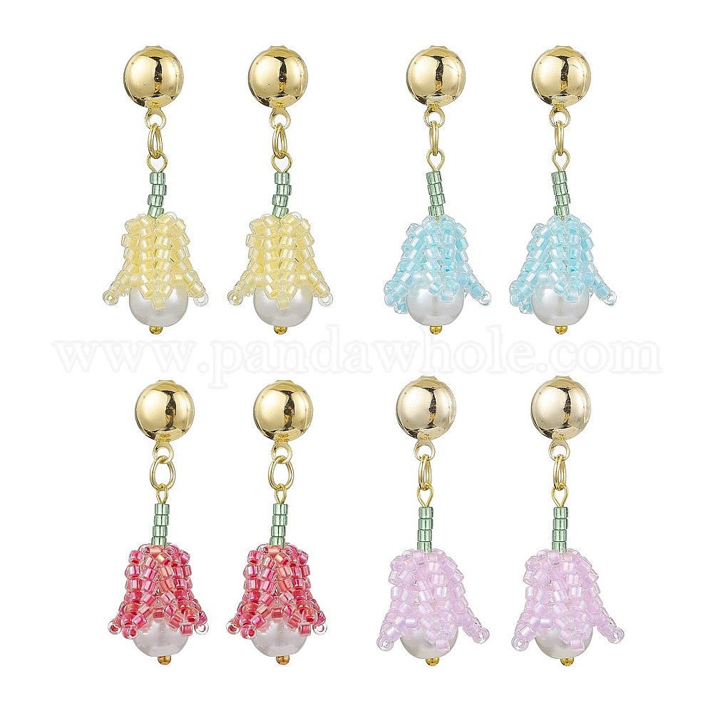 Серьги-гвоздики из цветка из стеклянного бисера ручной работы, с пластиковой жемчужины, золотые