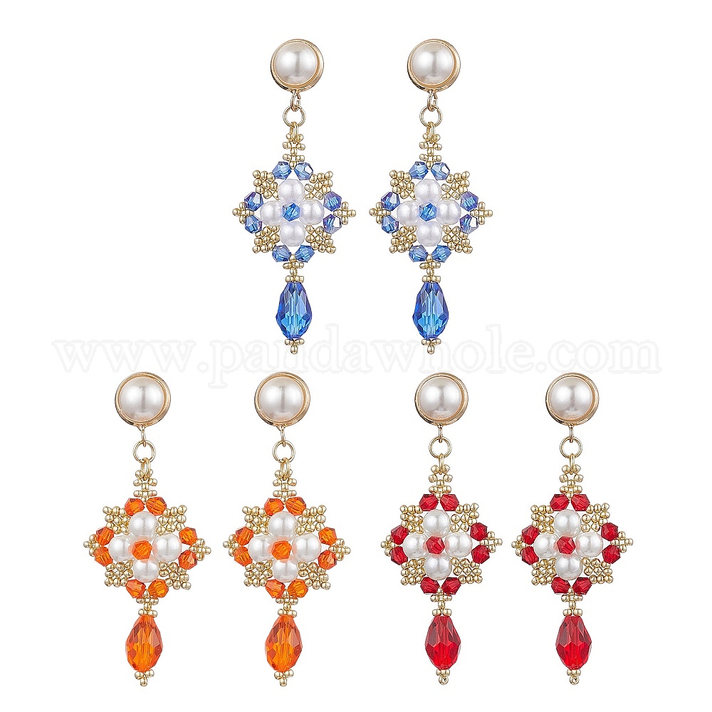 • Красный Круглые серьги-гвоздики из стеклянного бисера и стеклянного жемчуга ручной работы, Ткацкий станок, китайское вязание, золотые, красные, 65x27 мм