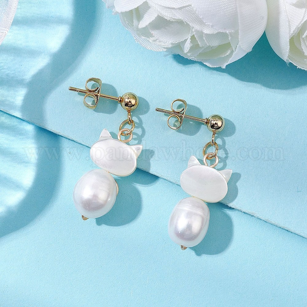 304 из нержавеющей стали болтаться серьги, с натуральной жемчужиной, форма кошки