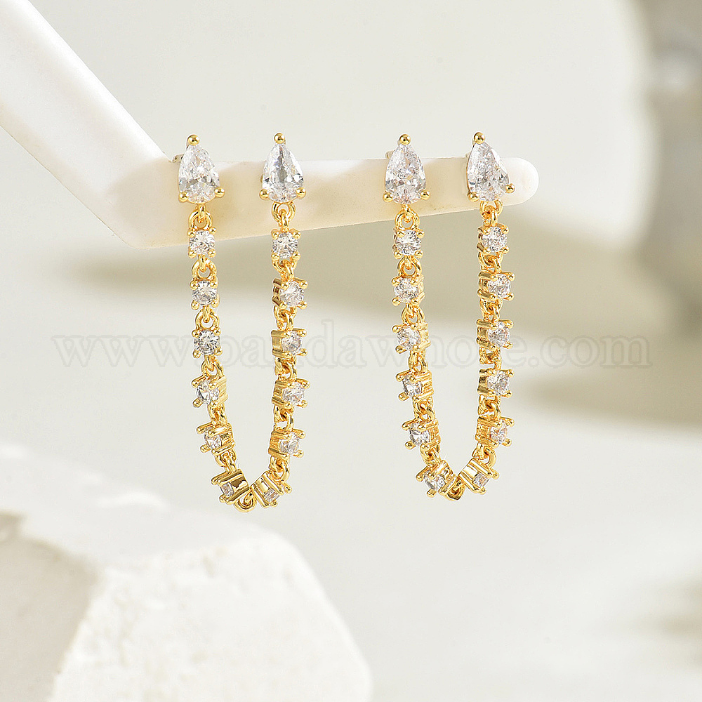 • Золотой Серьги-гвоздики с кисточками из латуни с прозрачными кубическими цирконами, слеза, золотые, 75 мм