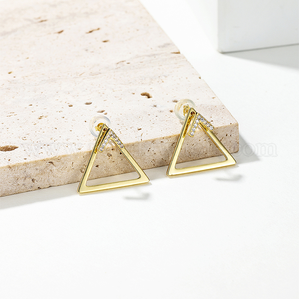 • Золотой Серьги-гвоздики из латуни с прозрачным кубическим цирконием в форме полого треугольника, золотые, 16x19 мм
