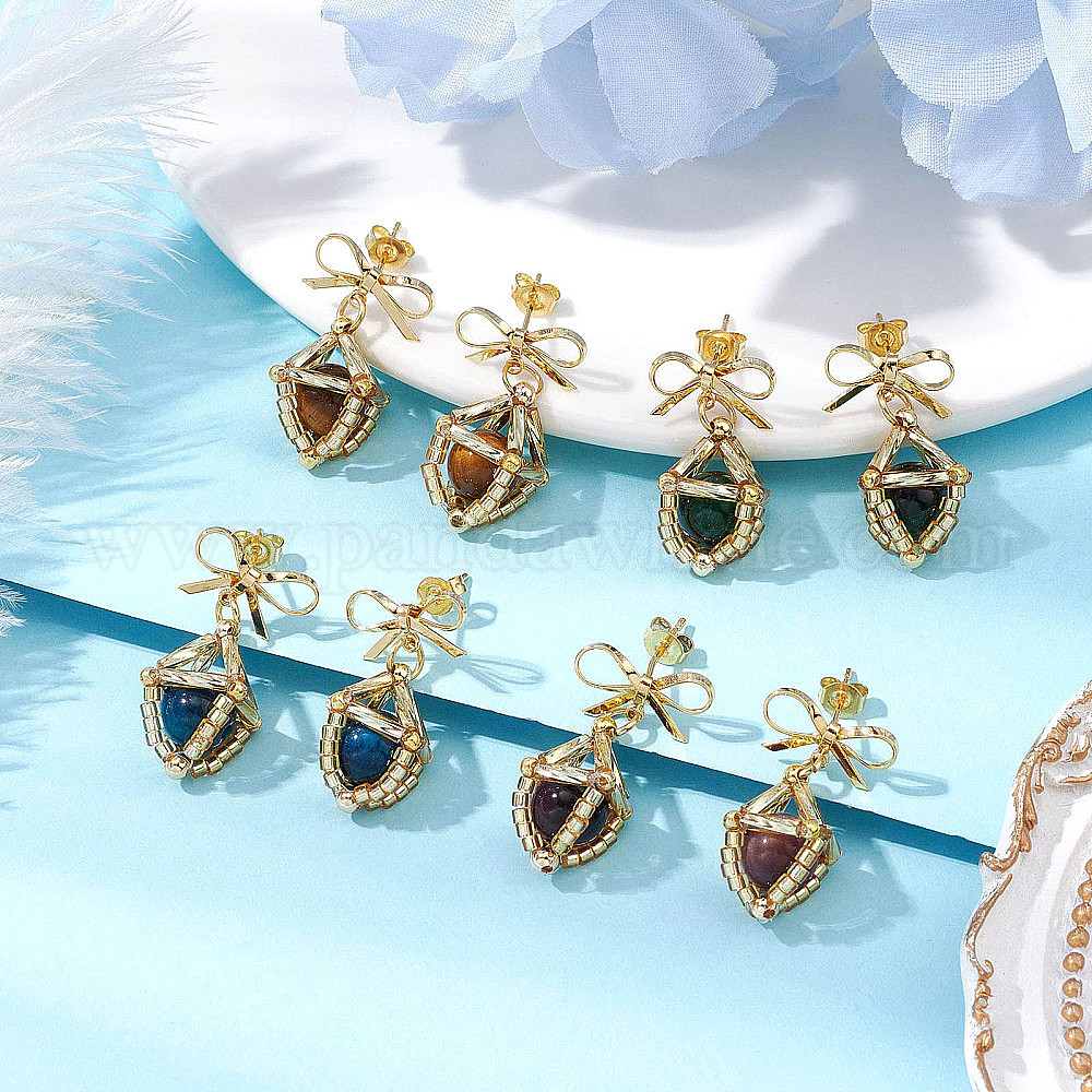 Серьги-гвоздики с бантом из натурального тигрового глаза, с латунными серьгами, золотые