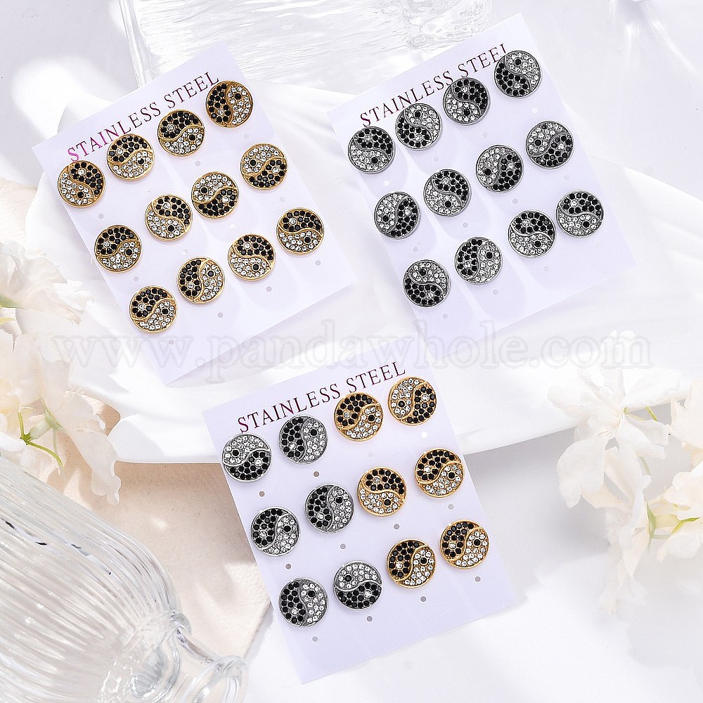 • Нержавеющая Сталь Цвет 304 серьги из нержавеющей стали горный хрусталь, вакуумное покрытие pvd, плоские круглые с инь-янь, цвет нержавеющей стали, 13 мм, 6 пара / комплект