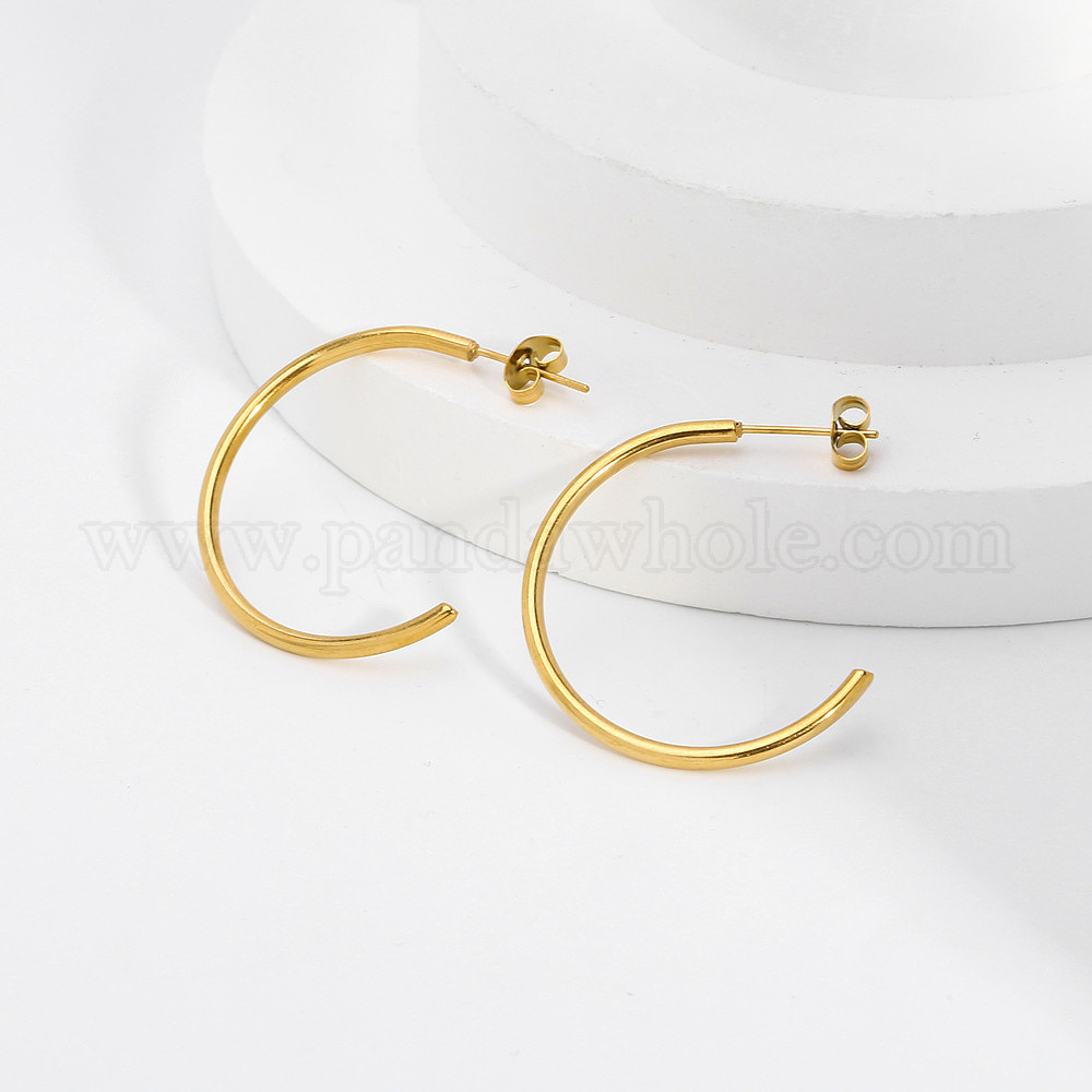 • Настоящее золото 18K Классические 304 серьги-гвоздики из нержавеющей стали в форме буквы С, реальный 18 k позолоченный, 32x2 мм