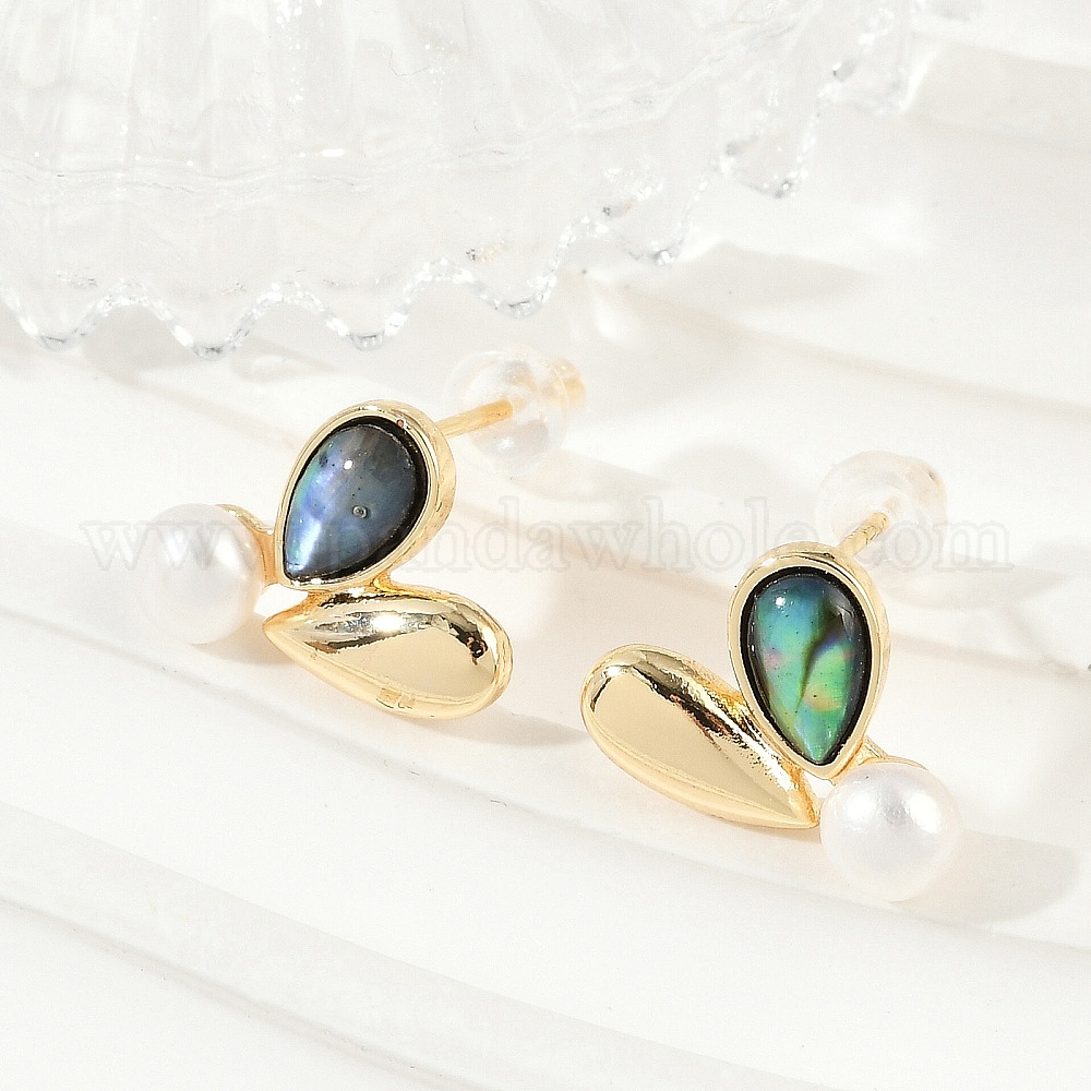 Серьги-гвоздики из латунной ракушки-слезинки, с имитацией жемчуга (031BPK)