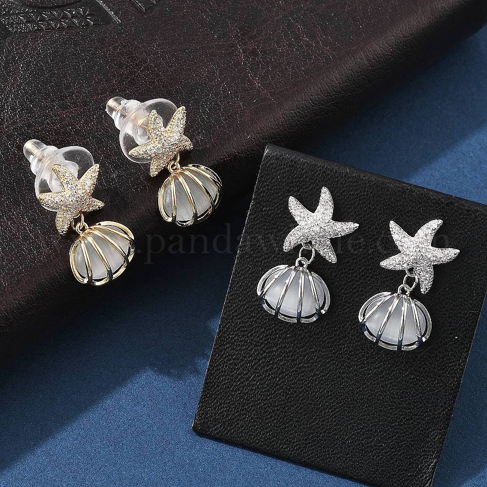 Серьги-гвоздики из латуни в форме ракушки с прозрачным кубическим цирконием, с лунным камнем, серия океана