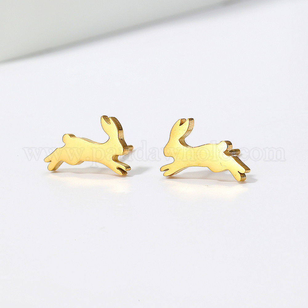 • Настоящее золото 18K Милые 201 серьги-гвоздики в виде кроликов из нержавеющей стали, реальный 18 k позолоченный, 8x12 мм