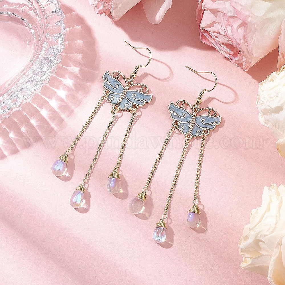 Звенья компонентов люстры из эмали из цинкового сплава, с гальваническими стеклянными шариками и паяными, граненые латунные цепочки-панцири и 304 крючки для сережек из нержавеющей стали, бабочка