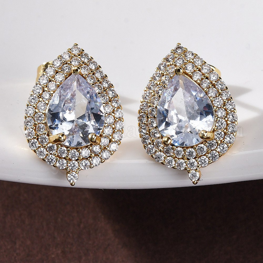 • Настоящее золото 16K Серьги-гвоздики из латуни с микропаве из прозрачных кубических цирконий в форме капли, реальный 16 k позолоченный, 17.5x12 мм