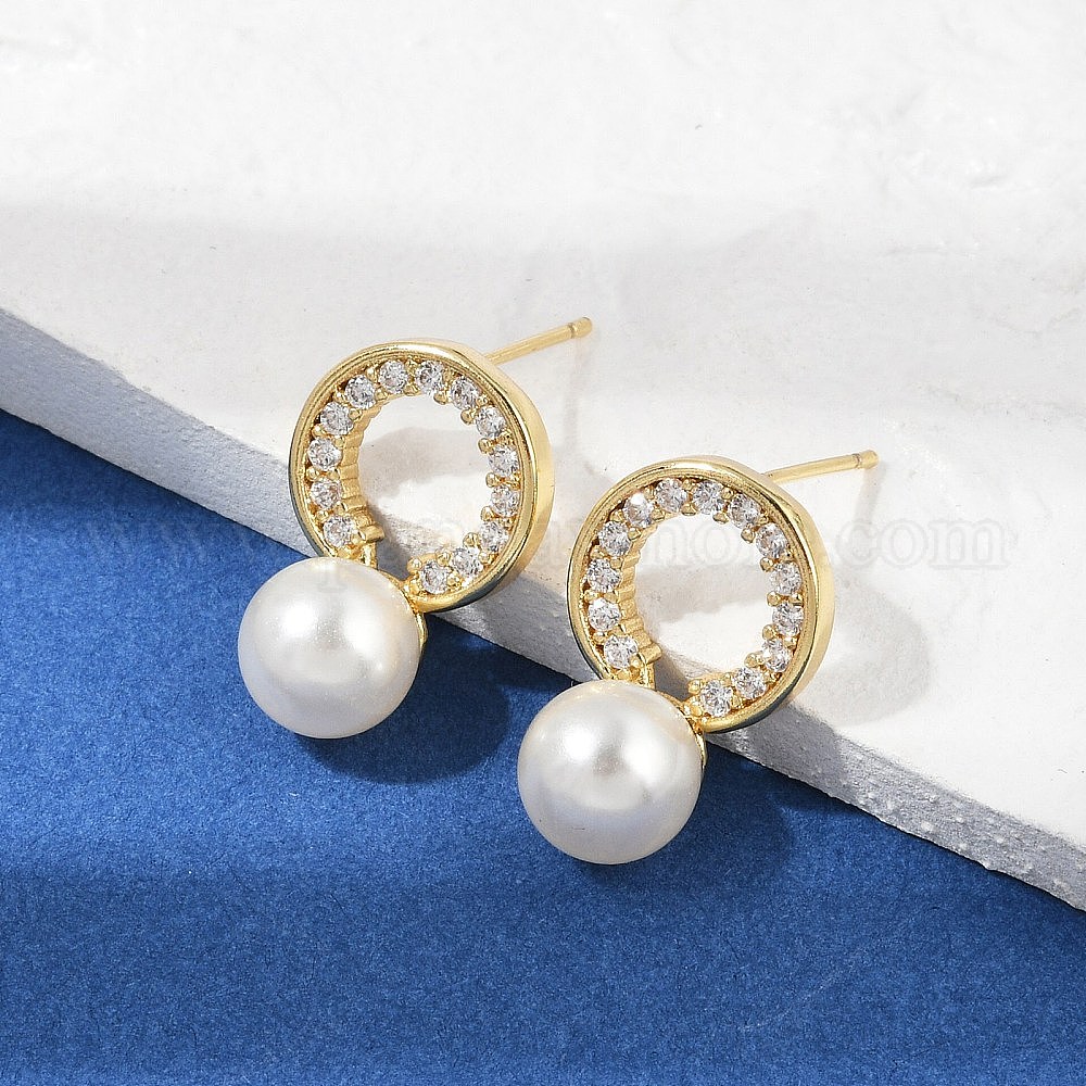 • Настоящее золото 18K Плоские круглые серьги-гвоздики из латуни с микропаве и прозрачным фианитом, с абс пластмассовыми шариками, без свинца и без кадмия, долговечный, реальный 18 k позолоченный, 17.5x12 мм