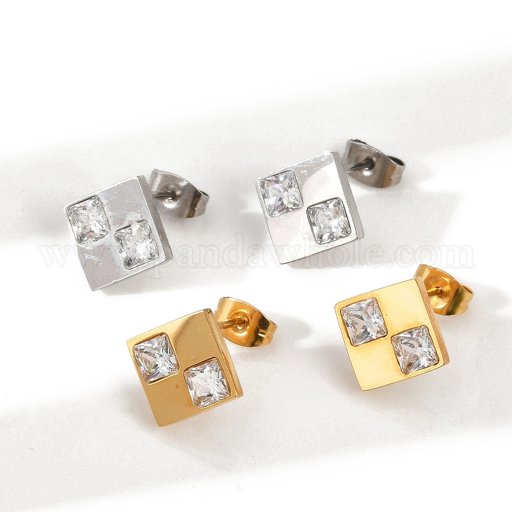 304 Серьги-гвоздики из нержавеющей стали с прозрачным фианитом и микропаве, ромб, ионное покрытие (ip)