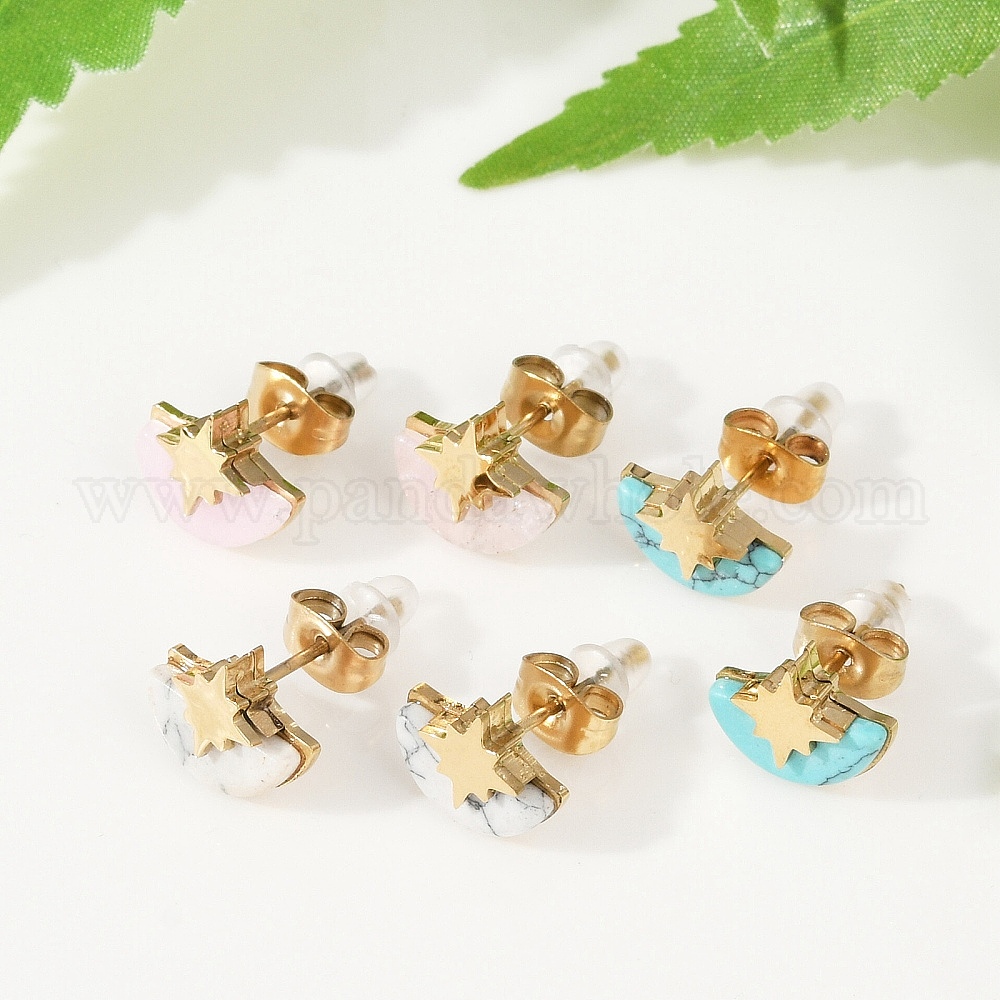 304 из нержавеющей стали серьги, с синтетическим драгоценным камнем, ионное покрытие (ip), звезда с полукругом, золотые