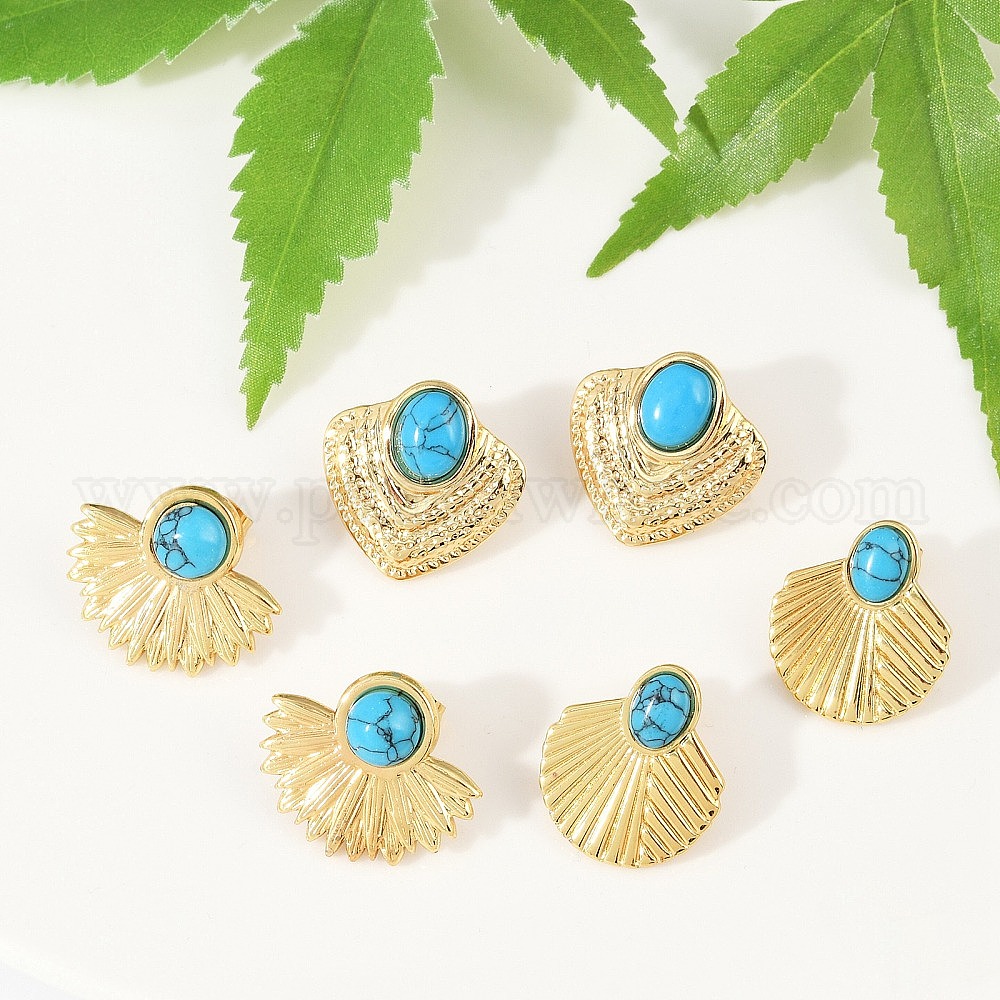 Вентилятор 304 серьги-гвоздики из нержавеющей стали с синтетической бирюзой для женщин, ионное покрытие (ip)