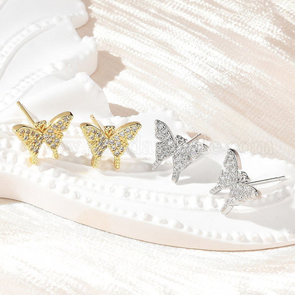 Серьги-гвоздики из латунного микро-паве, стойки покрытие, без свинца и без кадмия, бабочка