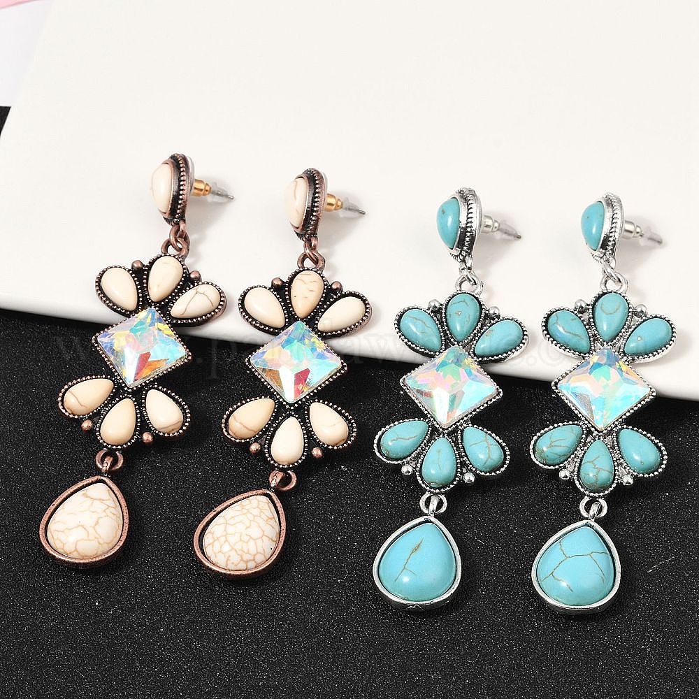 Серьги-гвоздики из сплава синтетической бирюзы, со стеклом, ромб со слезой