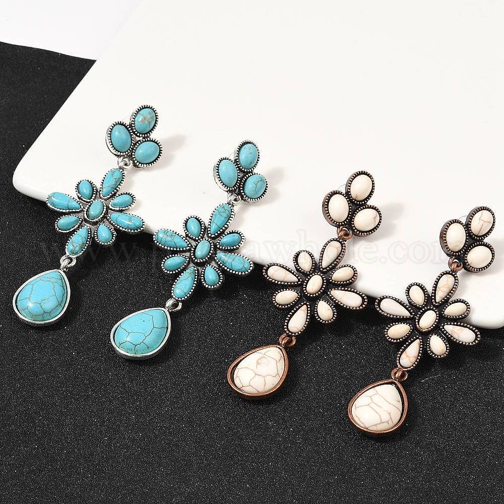 • Античное Серебро Серьги-гвоздики из сплава синтетической бирюзы, цветок с каплей, античное серебро, 81.5x31 мм