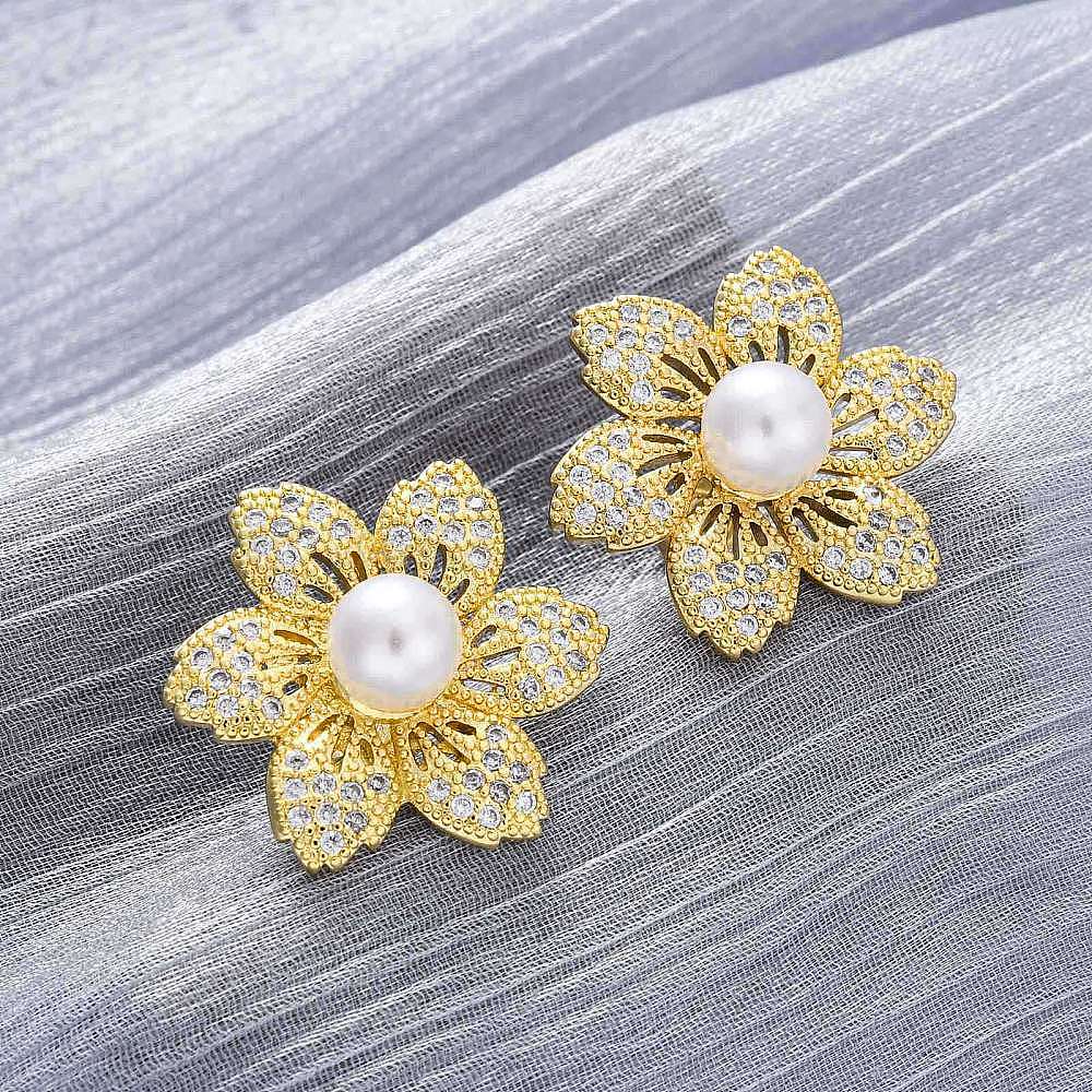 Серьги-гвоздики из латуни с микро-паве и прозрачным фианитом, с пластмассовой жемчужиной abs, долговечный, без свинца и без кадмия