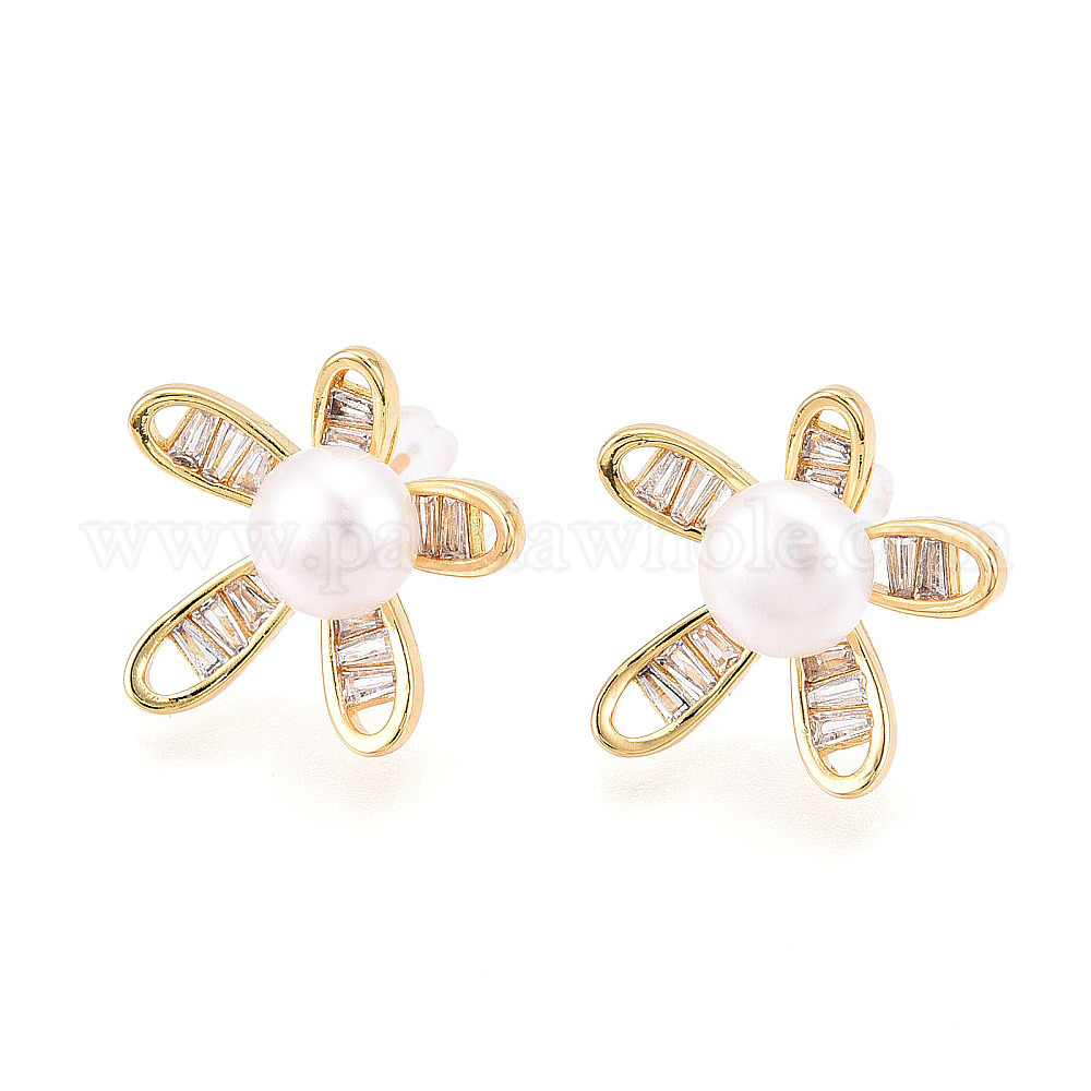 • Настоящее золото 18K Серьги-гвоздики из натурального жемчуга в форме цветка из латуни, с прозрачным кубическим цирконием и 925 булавками из стерлингового серебра, реальный 18 k позолоченный, 19.3x19~19.8 мм, штифты : 0.7 мм, Жемчужина: 8 мм