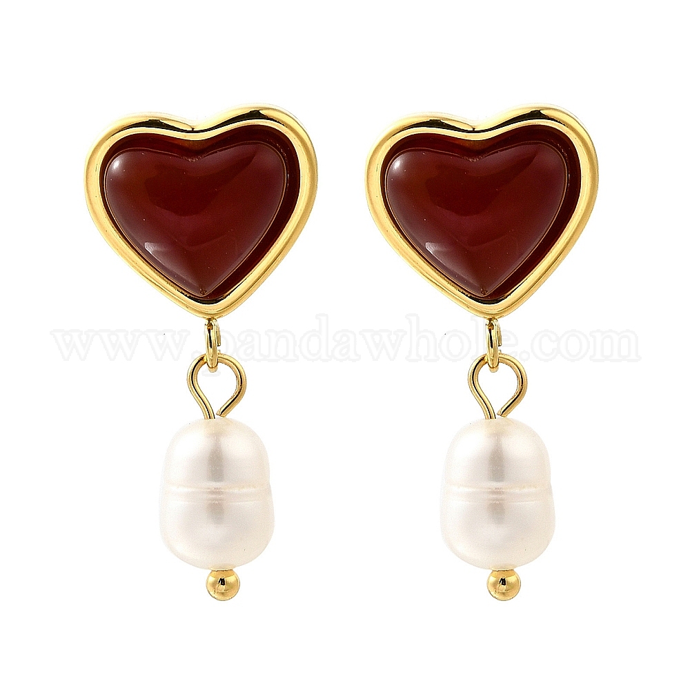 • Настоящее золото 18K Сердце 304 серьги-гвоздики из нержавеющей стали с красным агатом, с натуральной жемчужиной, реальный 18 k позолоченный, 34.50x20 мм