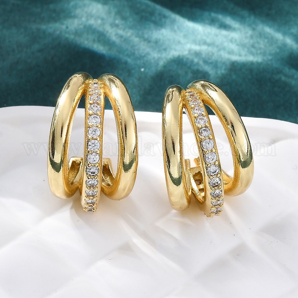 Серьги-гвоздики из латуни в форме тройной буквы С с микропаве из прозрачных кубических цирконий, без свинца и без кадмия, долговечный, стойки покрытие