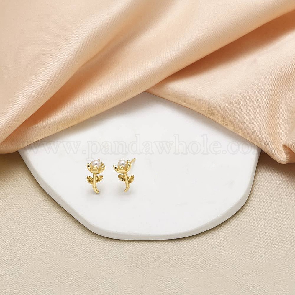 • Настоящее золото 18K Серьги-гвоздики из пластика и латуни с цветочным жемчугом, реальный 18 k позолоченный, 13x7 мм
