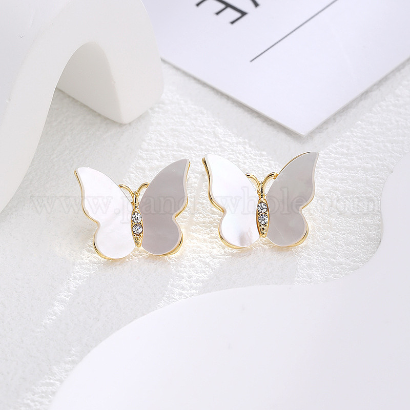 Серьги-гвоздики с бабочками из латуни с микропаве из прозрачных кубических цирконий, с ракушками и серебряными булавками