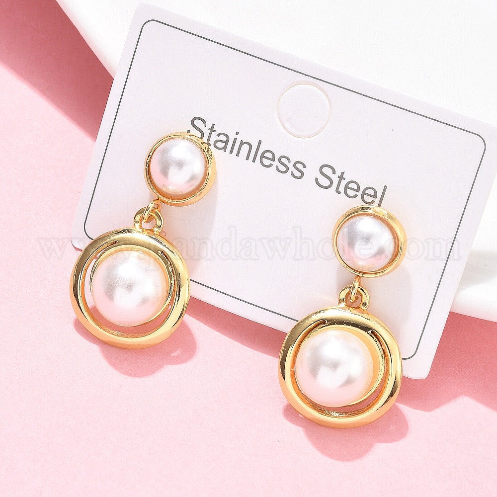 • Золотой Плоские круглые 304 из нержавеющей стали болтаться серьги-гвоздики, с абс пластмассовой имитационной жемчужиной, ионное покрытие (ip), золотые, 30x15.5 мм
