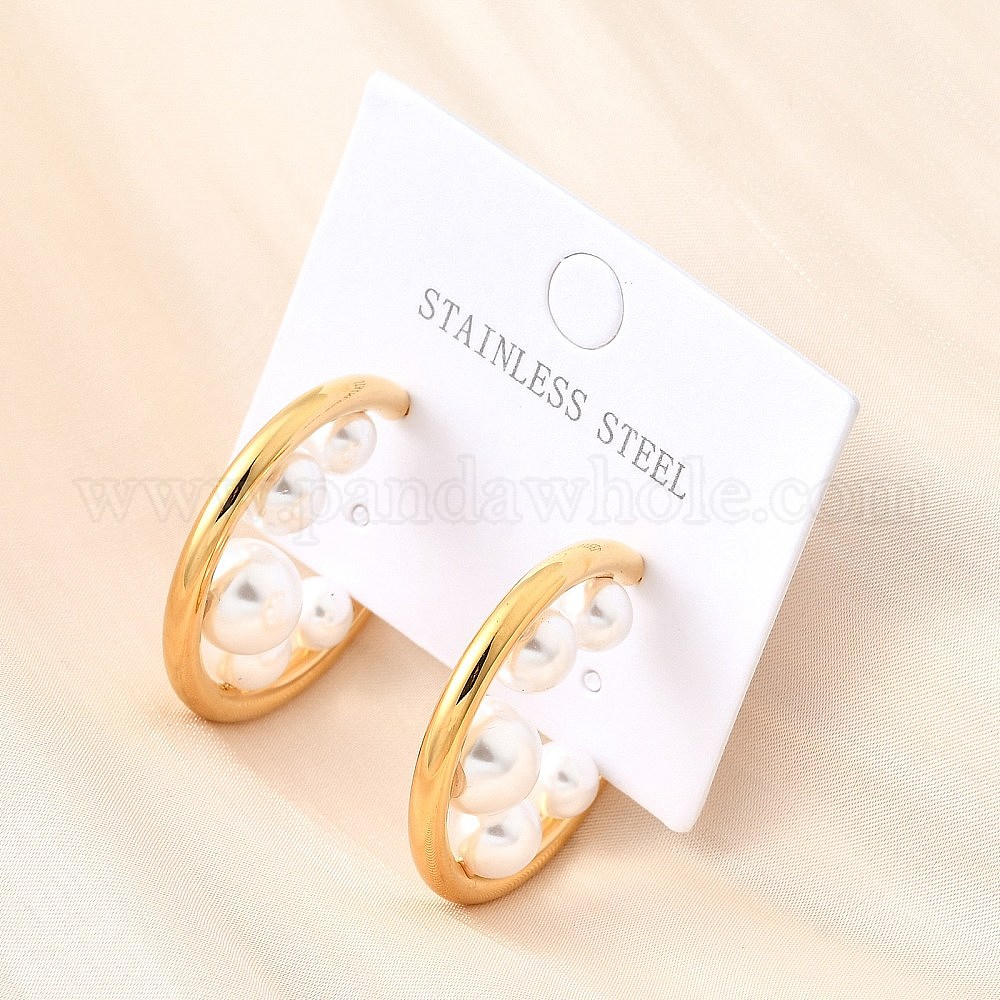 • Золотой C-образные 304 серьги-гвоздики из нержавеющей стали, с абс пластмассовой имитационной жемчужиной, ионное покрытие (ip), золотые, 30x9 мм