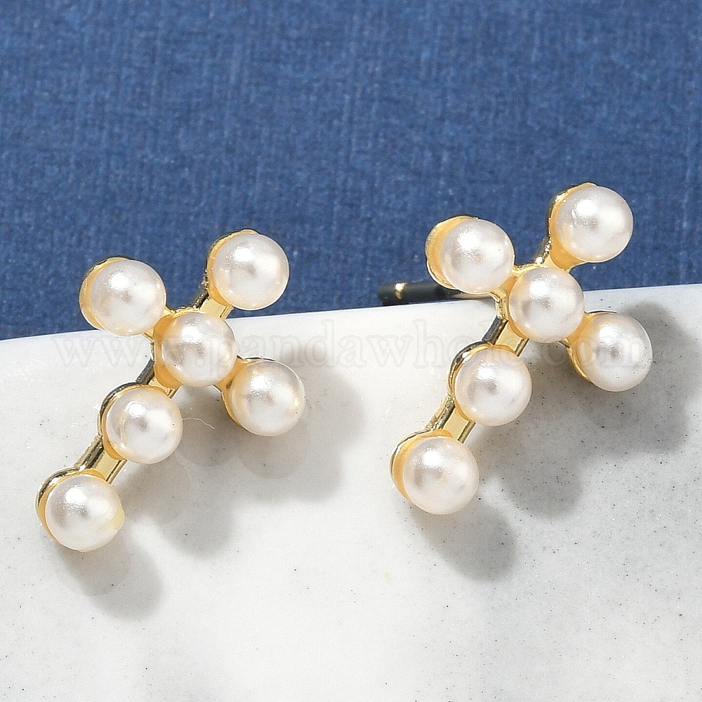 Серьги-гвоздики с крестом из латуни, с ABS имитации жемчуга, без свинца и без кадмия, долговечный (034435)