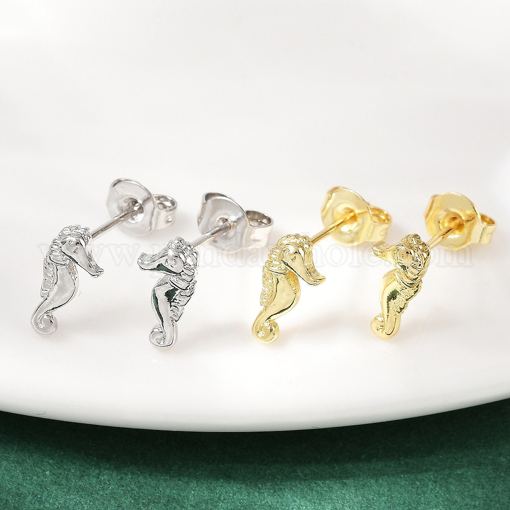 • Настоящее золото 18K Латунь серьги, морской конек, реальный 18 k позолоченный, 9x5 мм