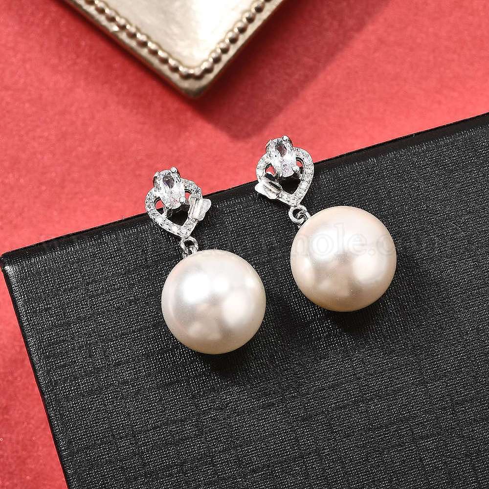 • Платина 925 серебряные серьги-гвоздики с прозрачным кубическим цирконием в форме сердца и круглыми подвесками, с имитацией жемчужины из ракушки, платина, 26x12.5 мм