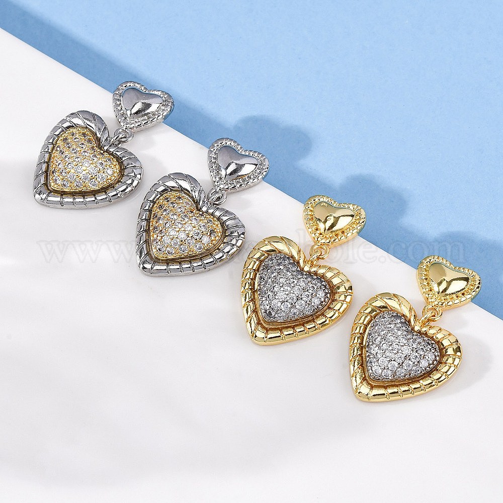 Серьги-подвески из латуни с прозрачным кубическим цирконием и прозрачным паве, сердце, без кадмия и без свинца, стойки покрытие, долговечный