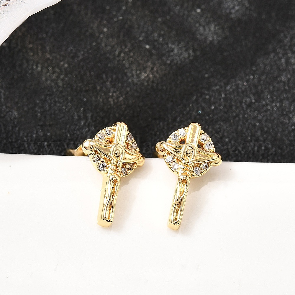 • Золотой Серьги-гвоздики из латуни с микропаве и прозрачным кубическим цирконием, без кадмия и без свинца, золотые, 13x8 мм